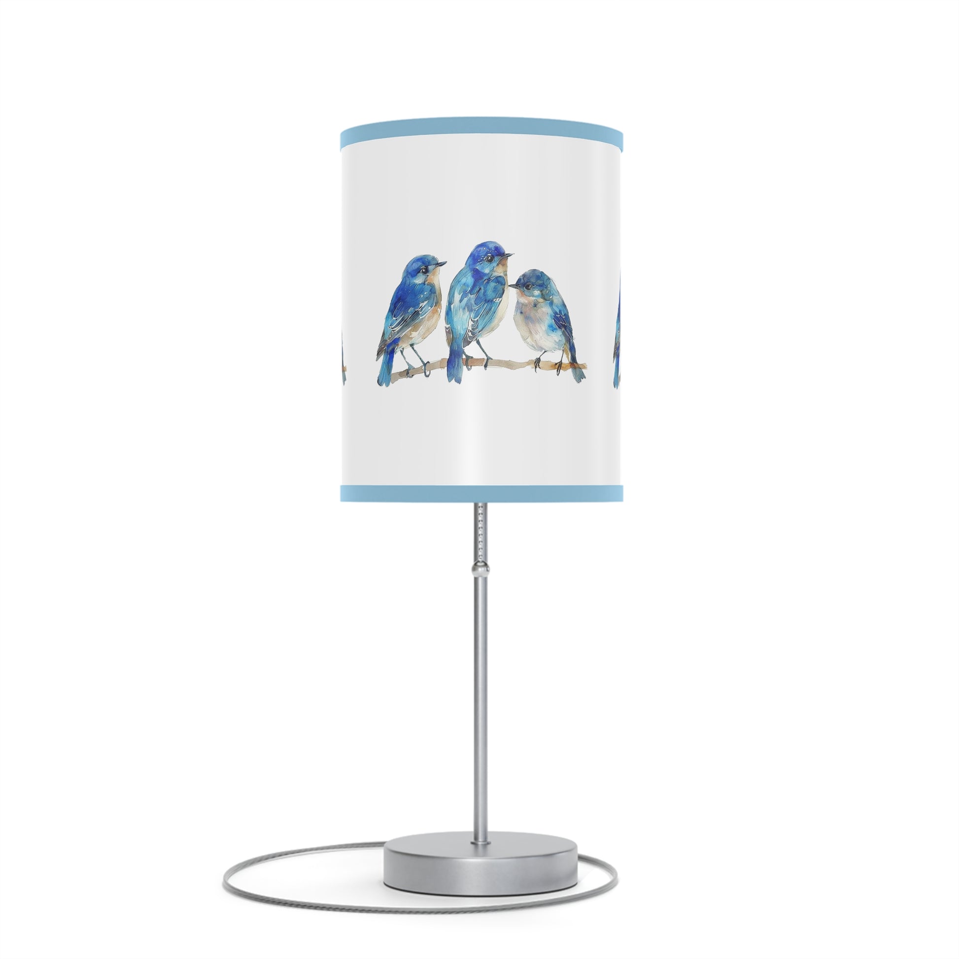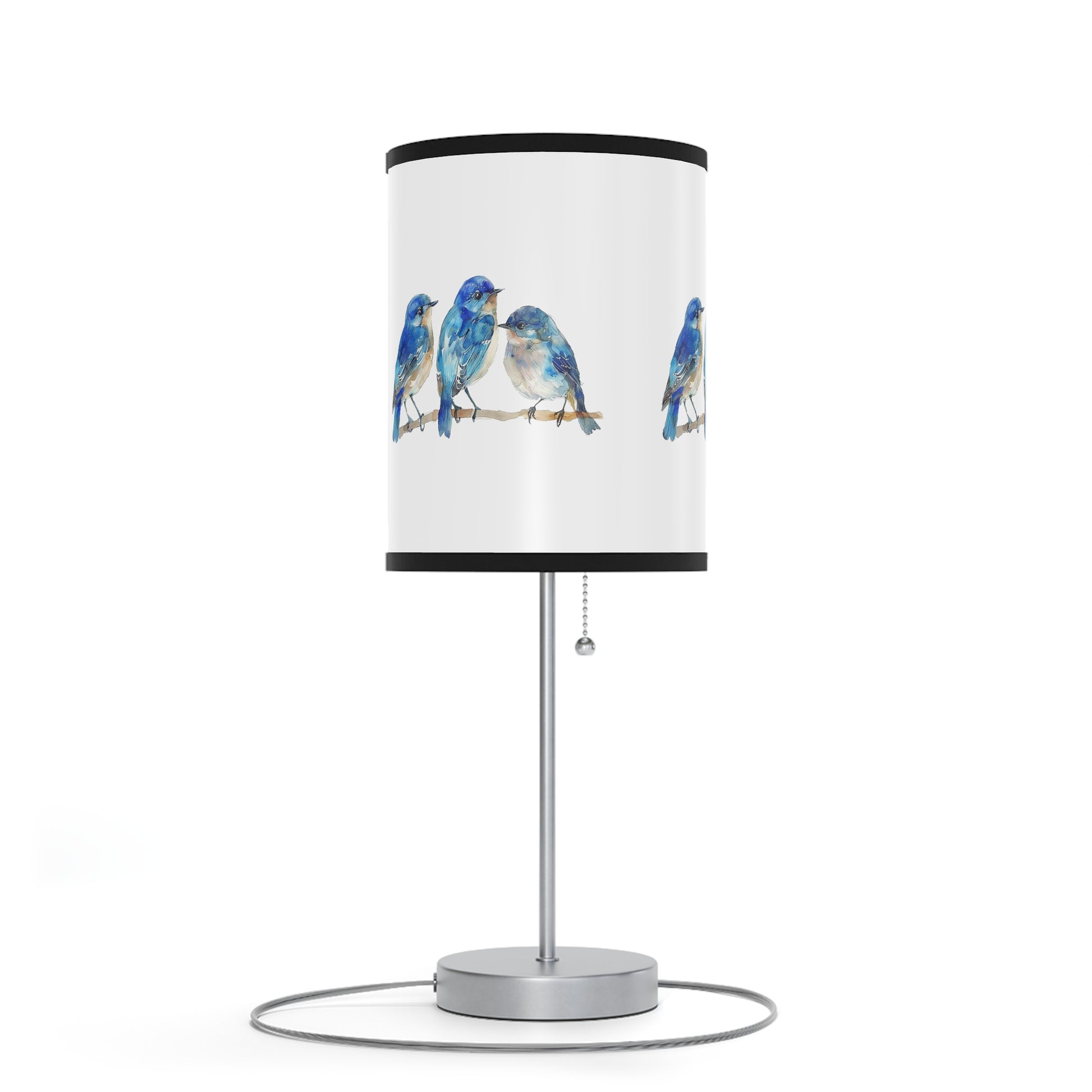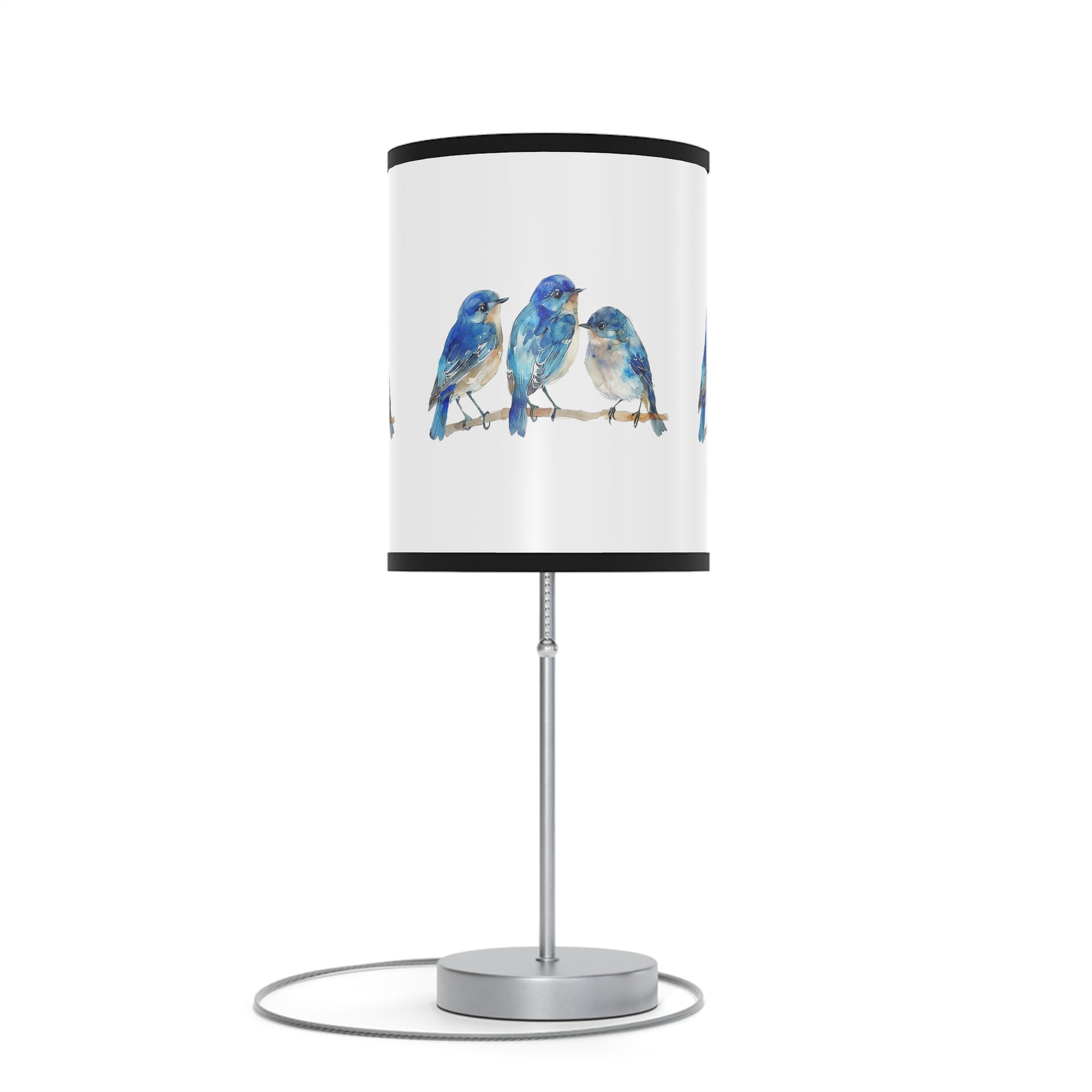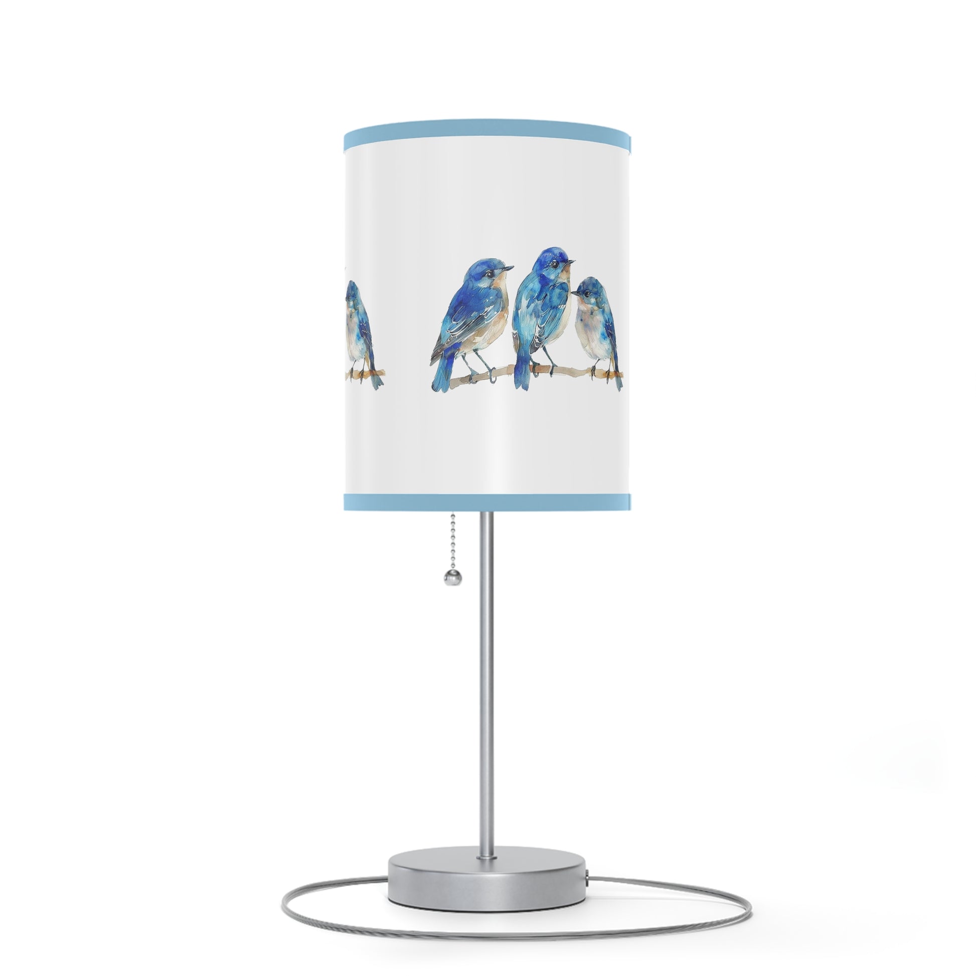 Bluebird Desk Lamp: Illuminate your space with the charming beauty of our Bluebird Desk Lamp, featuring a delightful watercolor painting of three bluebirds perched naturally on a branch. The crisp white background highlights the intricate details and vibrant colors of the bluebirds, creating a serene and picturesque scene. This Cute