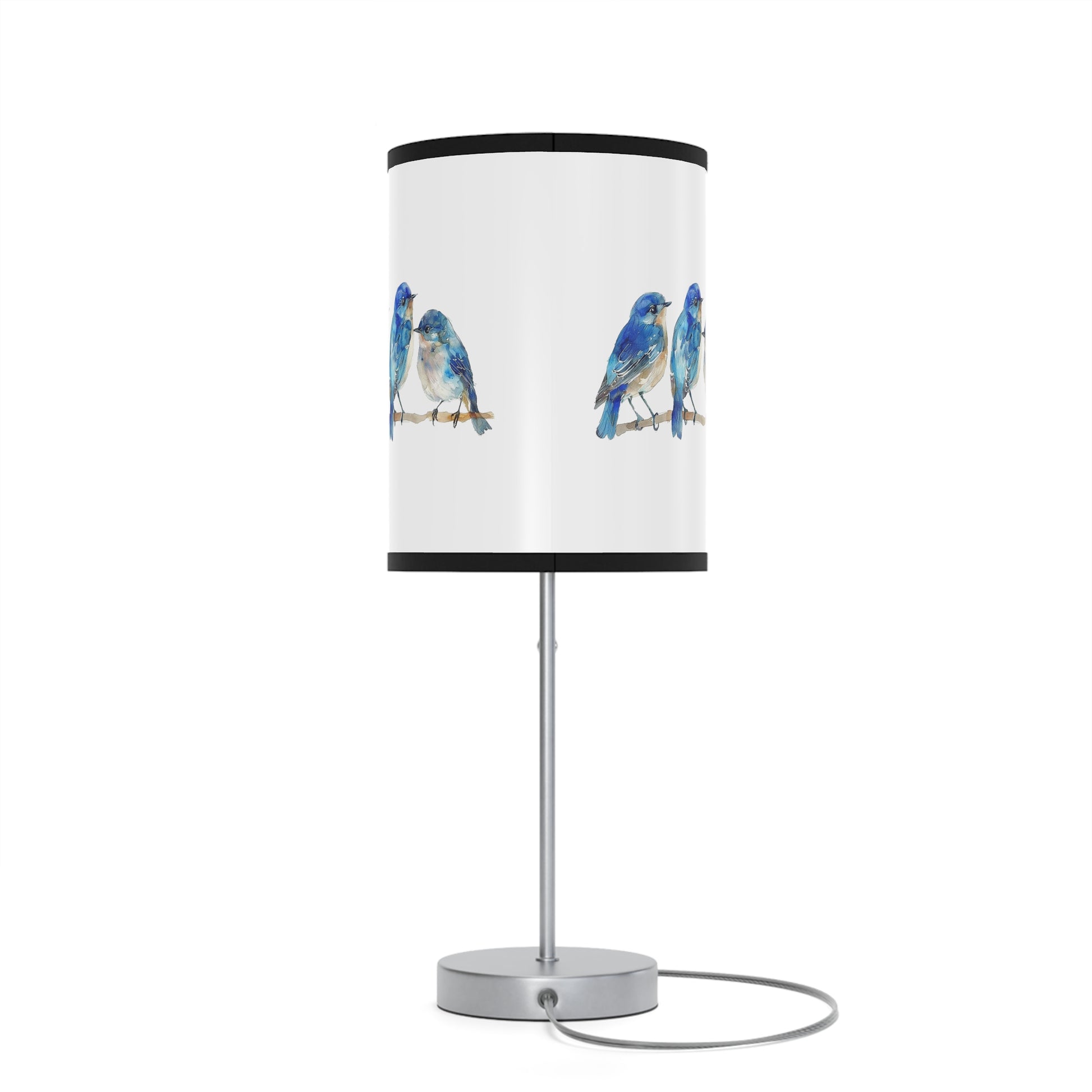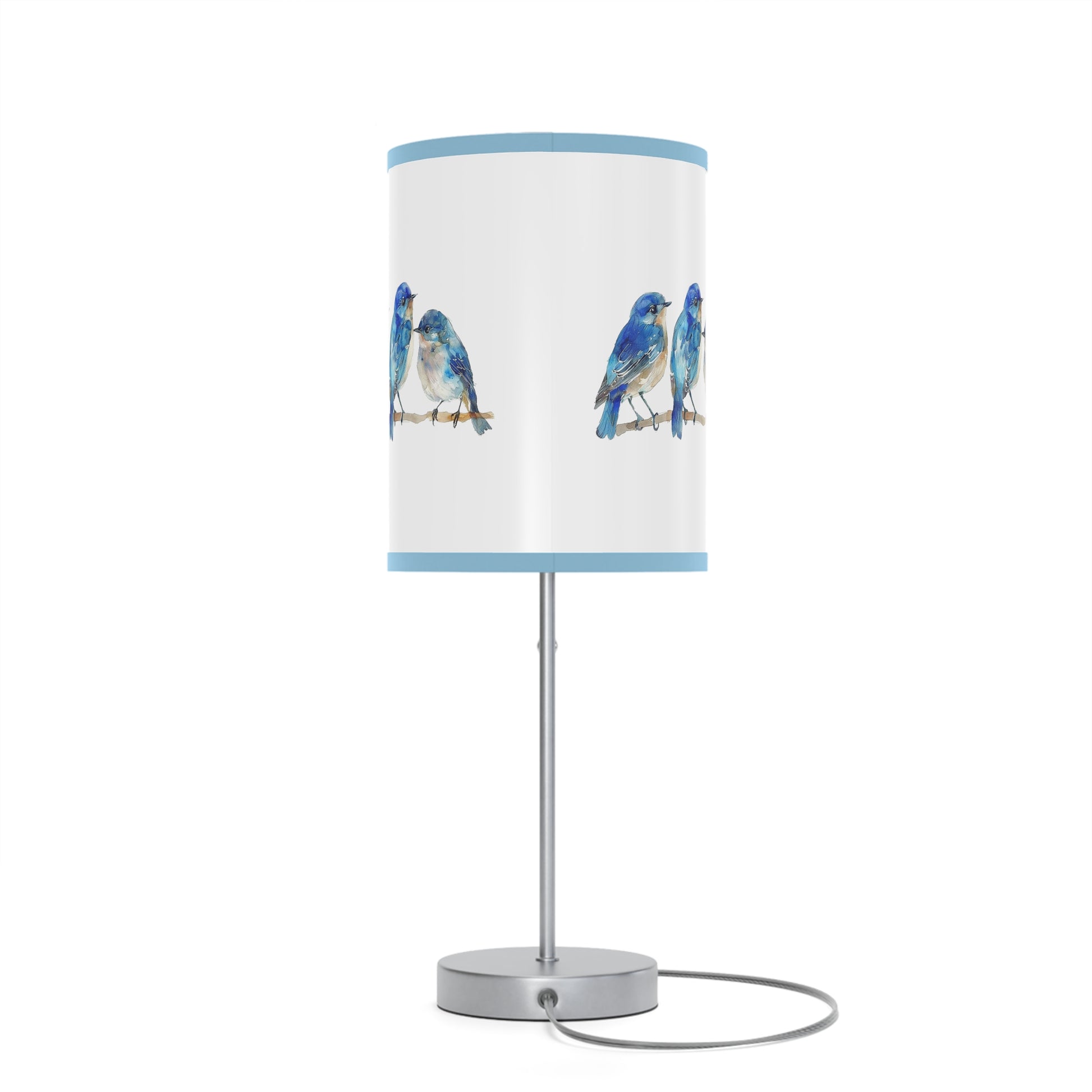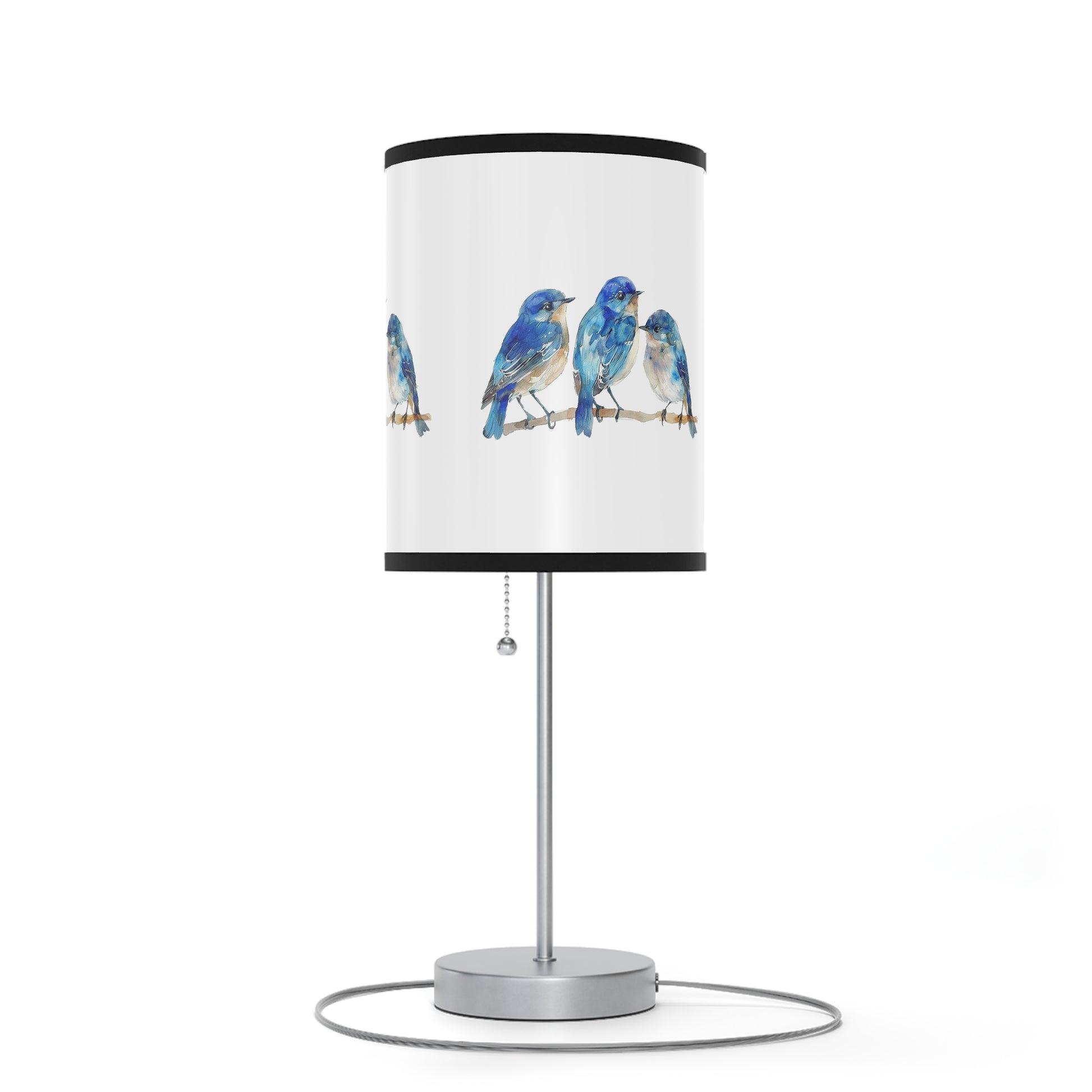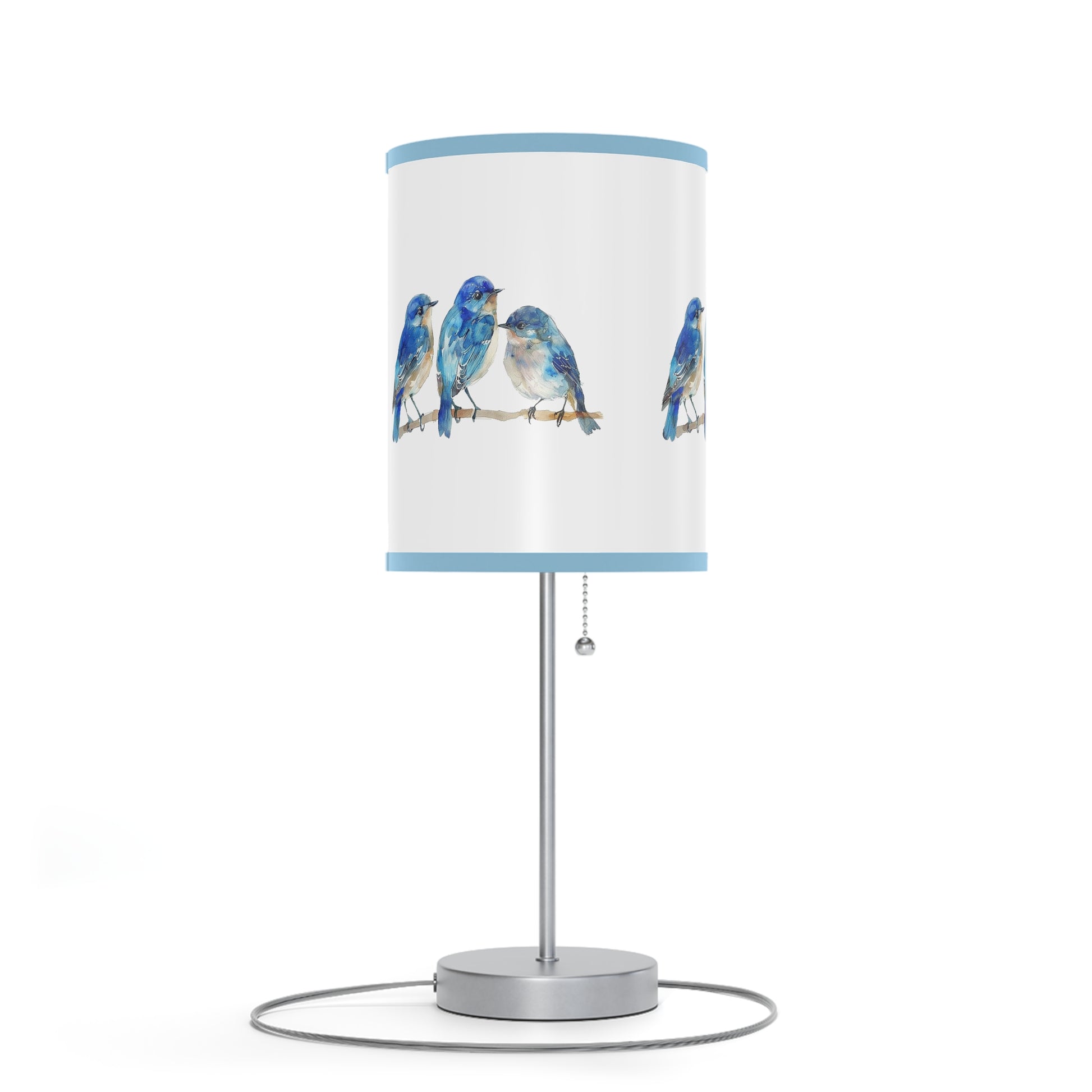 Bluebird Desk Lamp: Illuminate your space with the charming beauty of our Bluebird Desk Lamp, featuring a delightful watercolor painting of three bluebirds perched naturally on a branch. The crisp white background highlights the intricate details and vibrant colors of the bluebirds, creating a serene and picturesque scene. This Cute