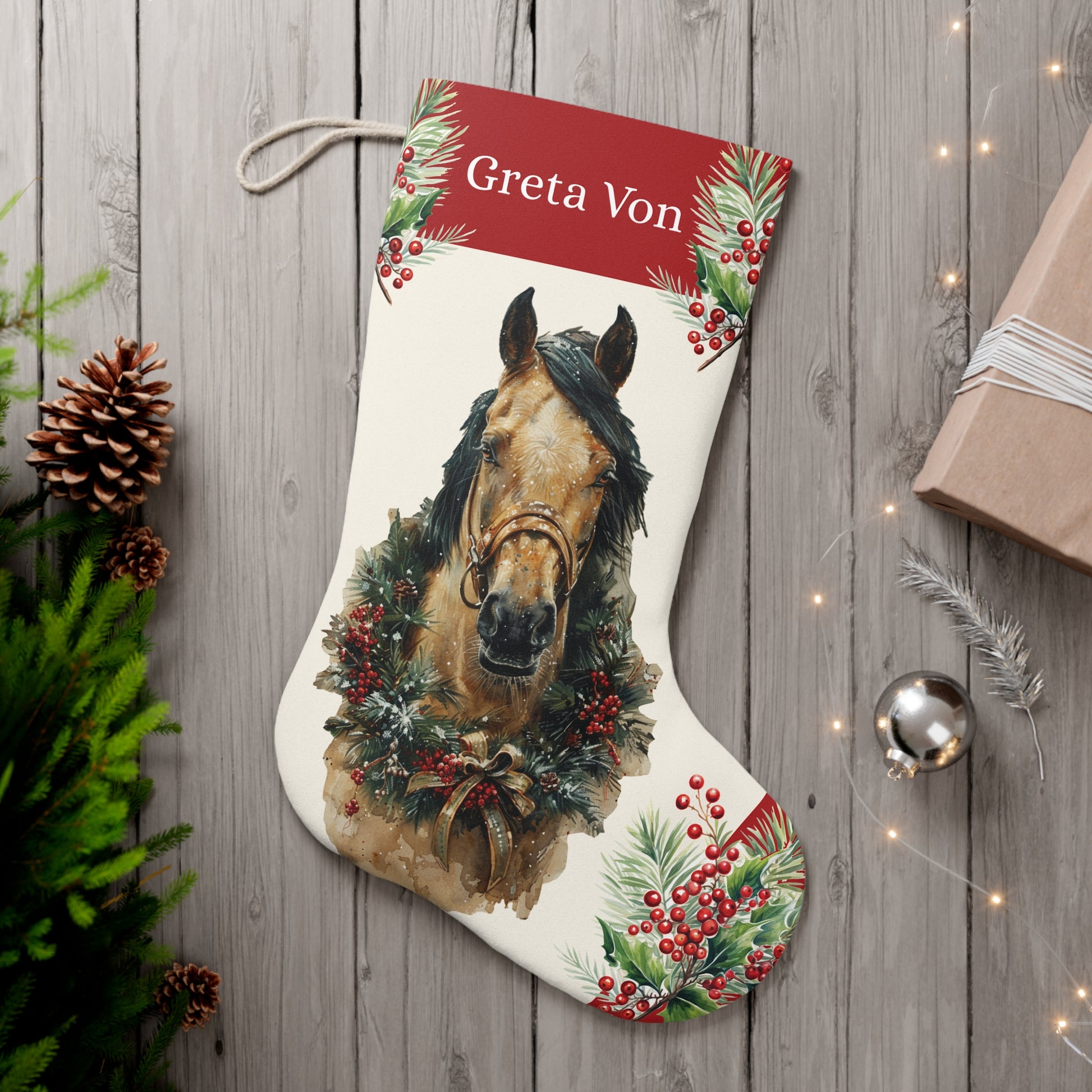 🎄 This stocking captures the spirit of the season in an elegant and unique way. Featuring an original painting of a horse's head adorned with Christmas greenery and bright red ribbons, it’s a perfect size for all your holiday gifts. The soft faux suede material adds a touch of luxury, and the all-over print ensures a beautiful look from every angle.