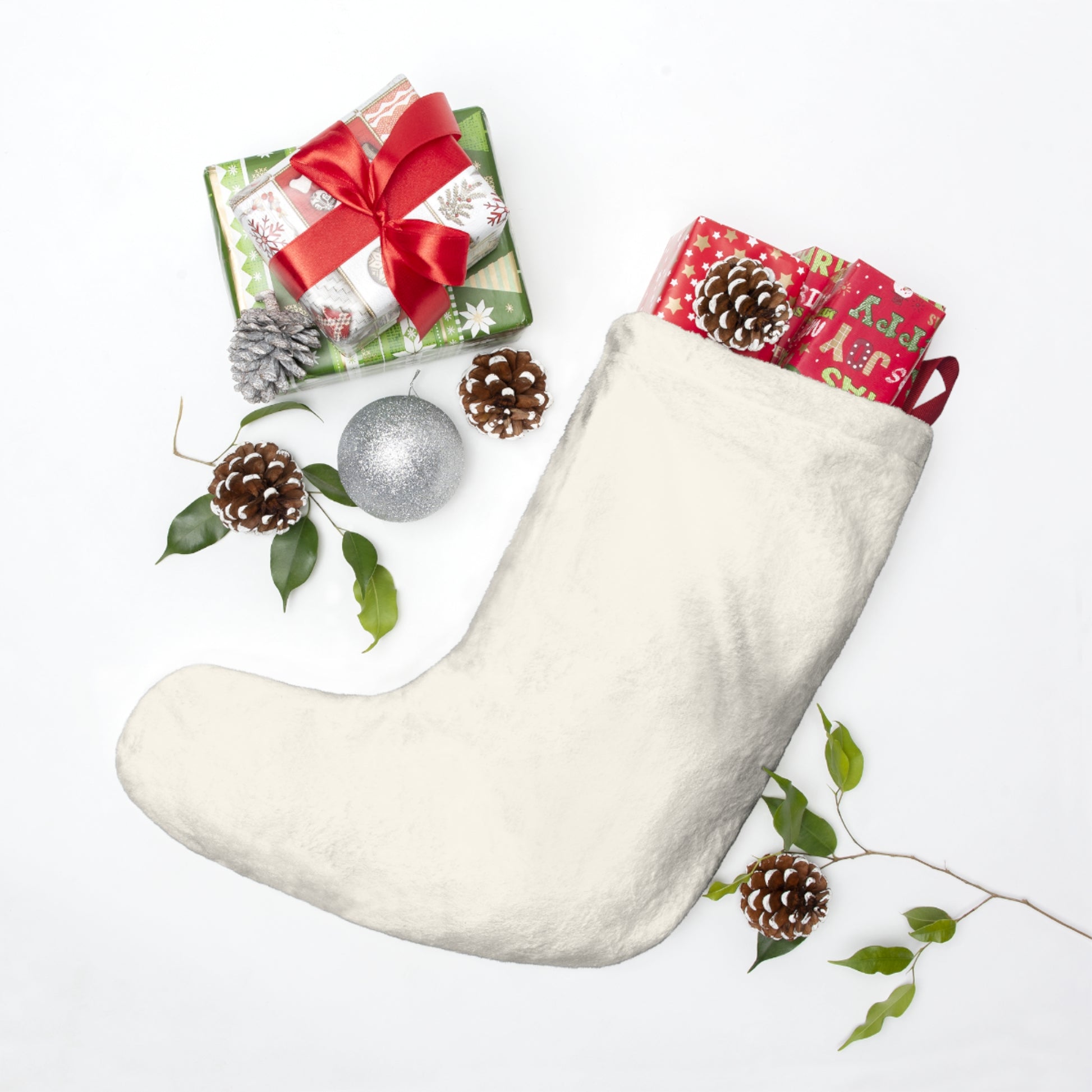 USA-made fleece Christmas stocking with original artwork. Soft, plush, durable, and spacious for gifts. Handmade designs from FlooredByArt Studio. A cozy and festive addition to your holiday décor.
