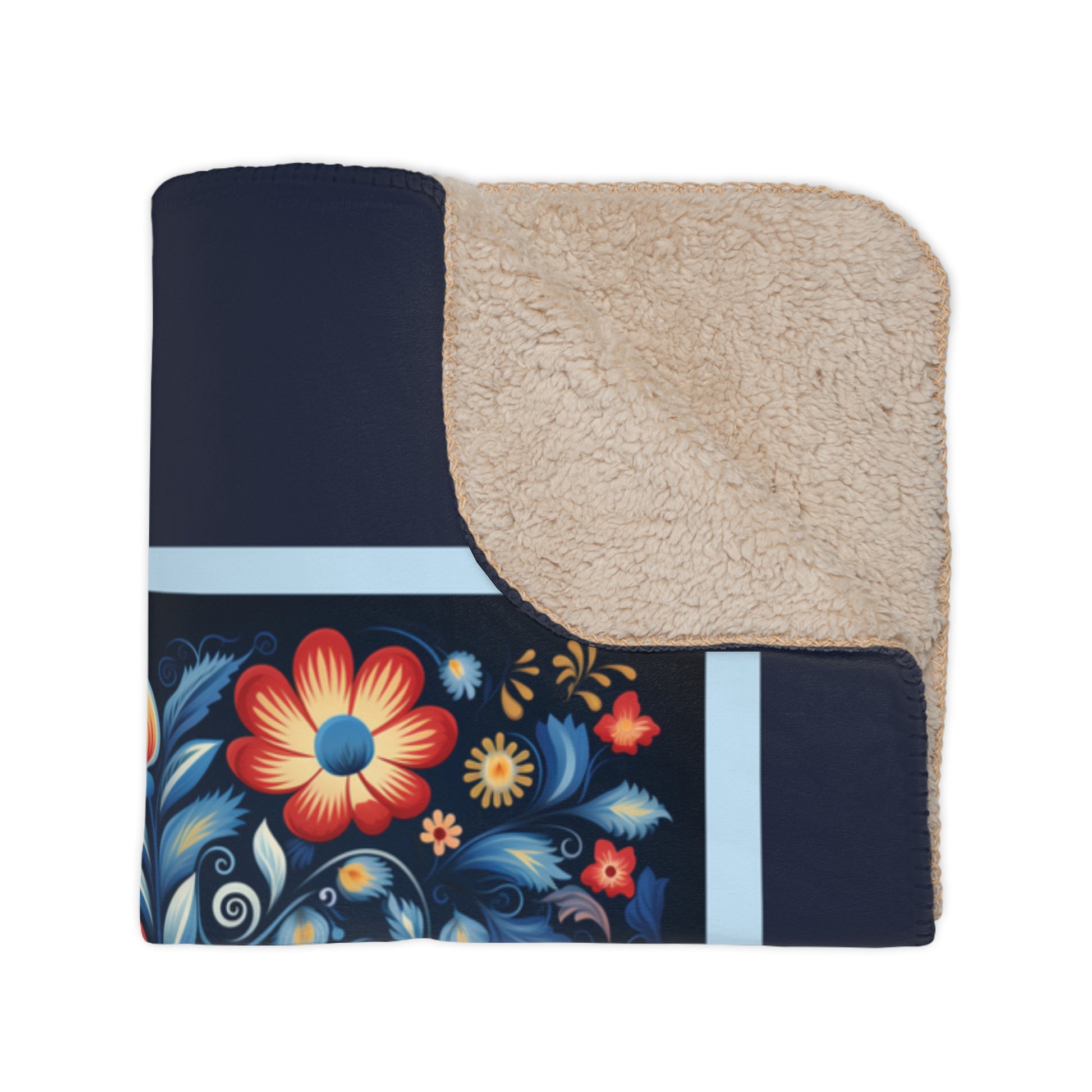 On the back, there is an extra layer of warmth and comfort from the ultra-soft tan sherpa filling. This blanket looks sleek and classy with its rounded sides and pretty stitching. Our Scandi Folk Art Blanket comes in two sizes and is the perfect mix of style and functionality, making it a must-have for any season or event. Keep it cozy all year with this super-soft sherpa blanket. Great for snuggles by the fireplace, picnics, and a quick power nap.