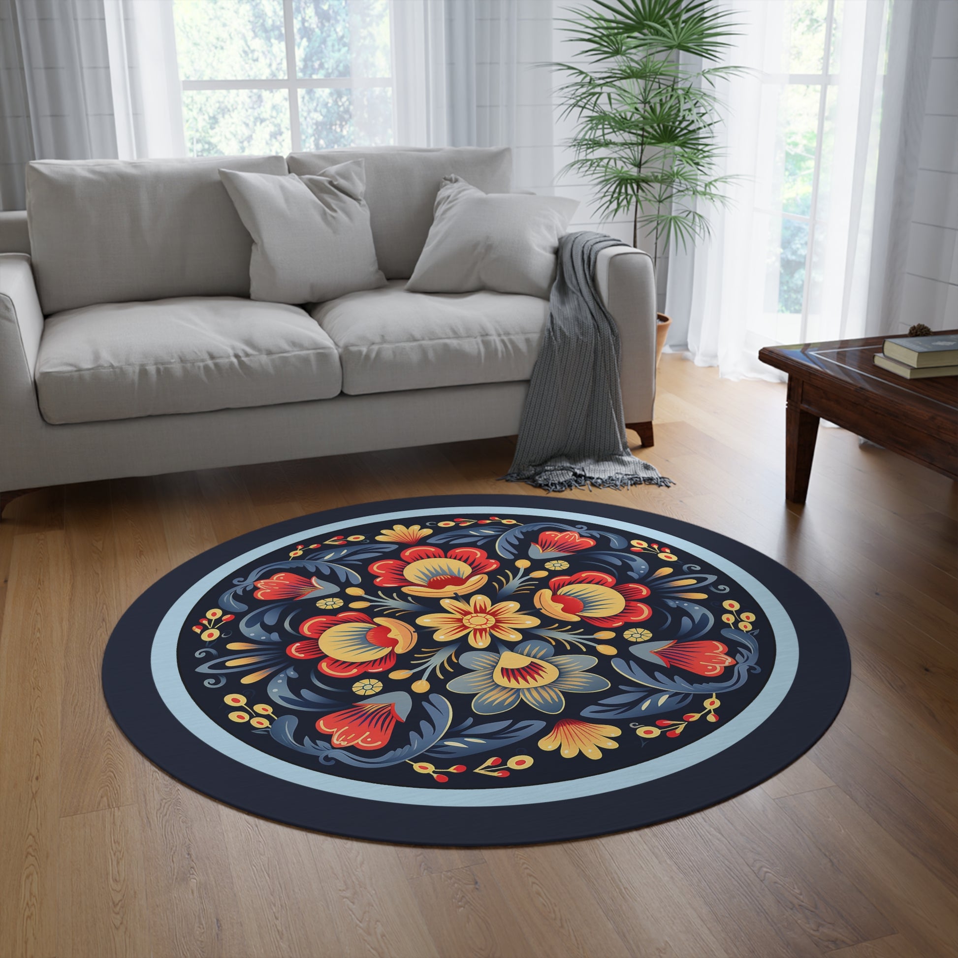 Navy Blue Scandi Folk Art Blanket, Scandinavian Art - Folk Art - Rosemaling