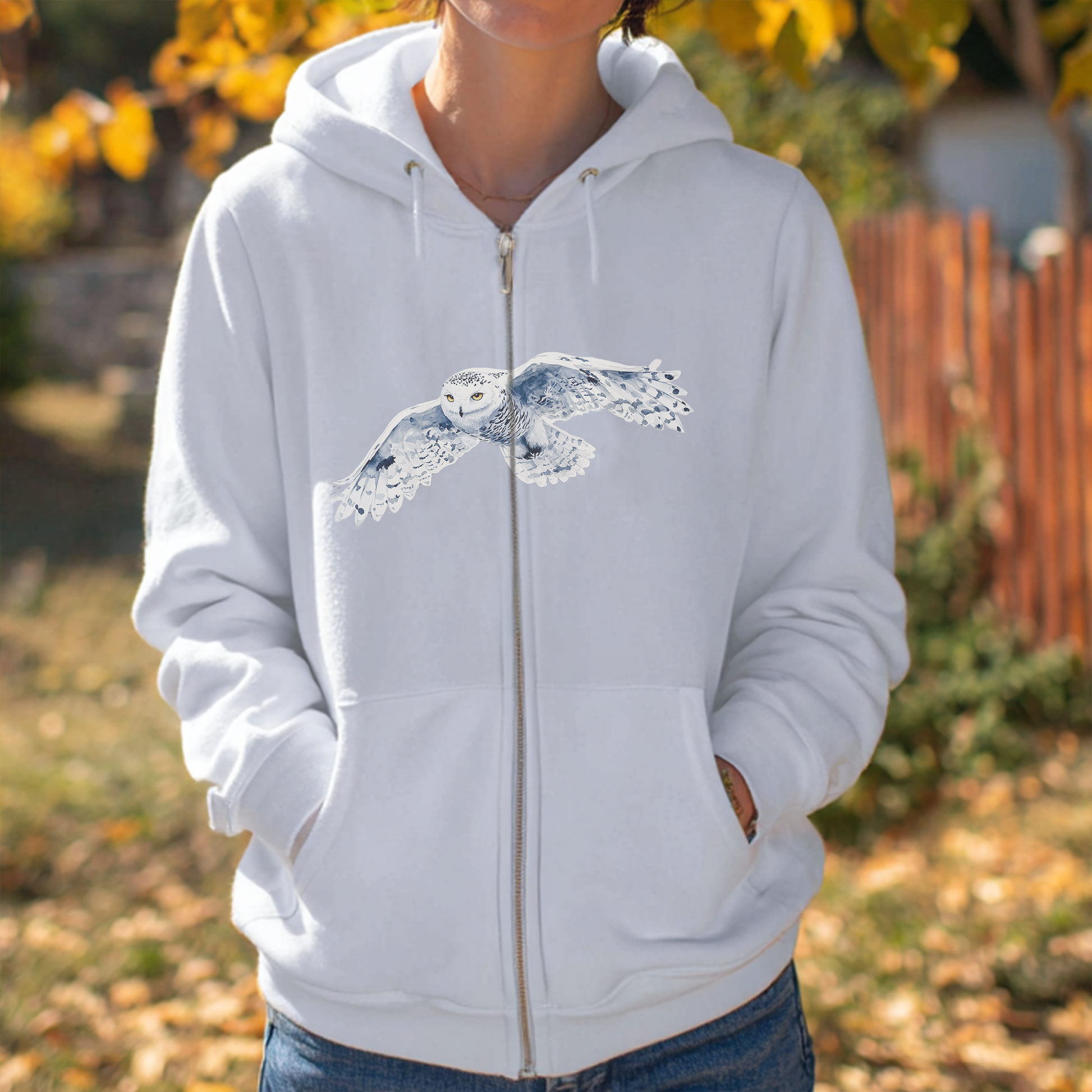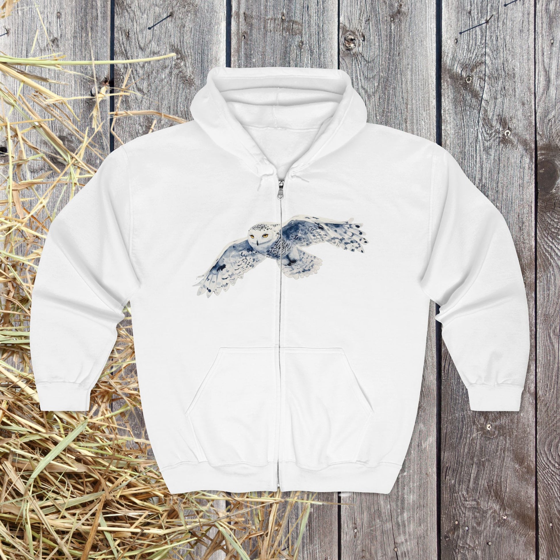 Snowy White Owl Watercolor Full Zip Hoodie — Flying Owl Nature Conservation